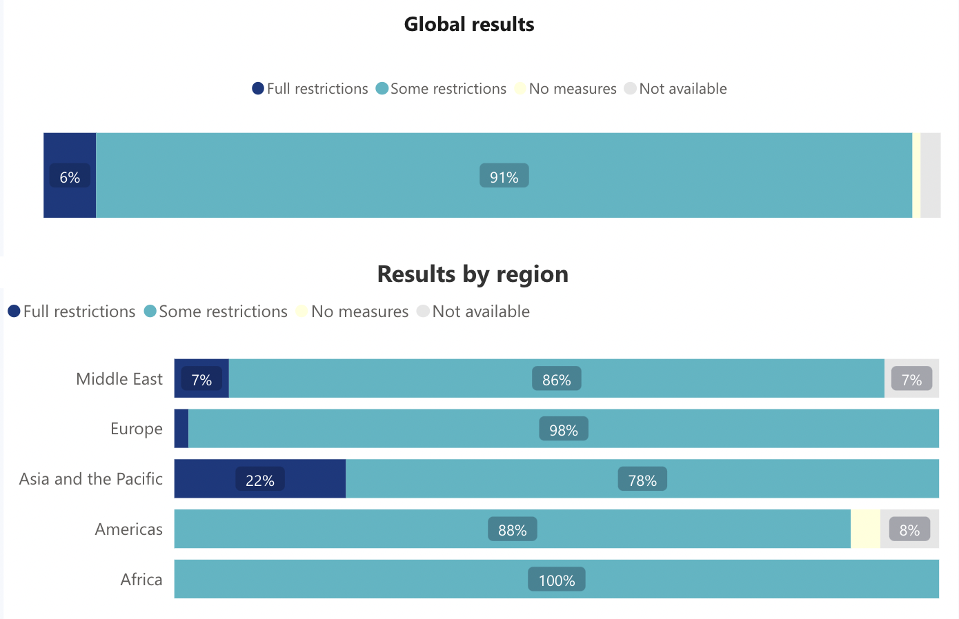 Al respecto, la Organización Mundial del Turismo, organismo perteneciente a Naciones Unidas, junto con IATA, principal organización aeronáutica mundial, desarrollaron un monitor, donde se informa en tiempo real las restricciones de cada uno de los países a los visitantes. A continuación, se podrá ver la diversidad de niveles de restricción impuestas en cada país.